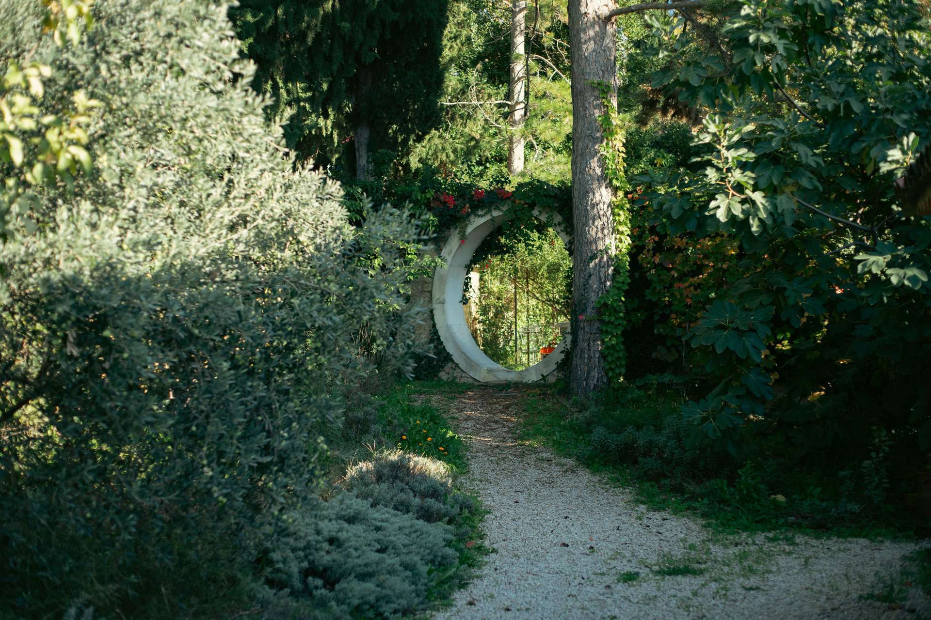 Passez le portail pour trouver un vaste parc traversé par une source, parsemé de cyprès, d’arbres fruitiers et de sculptures d’animaux fantastiques.